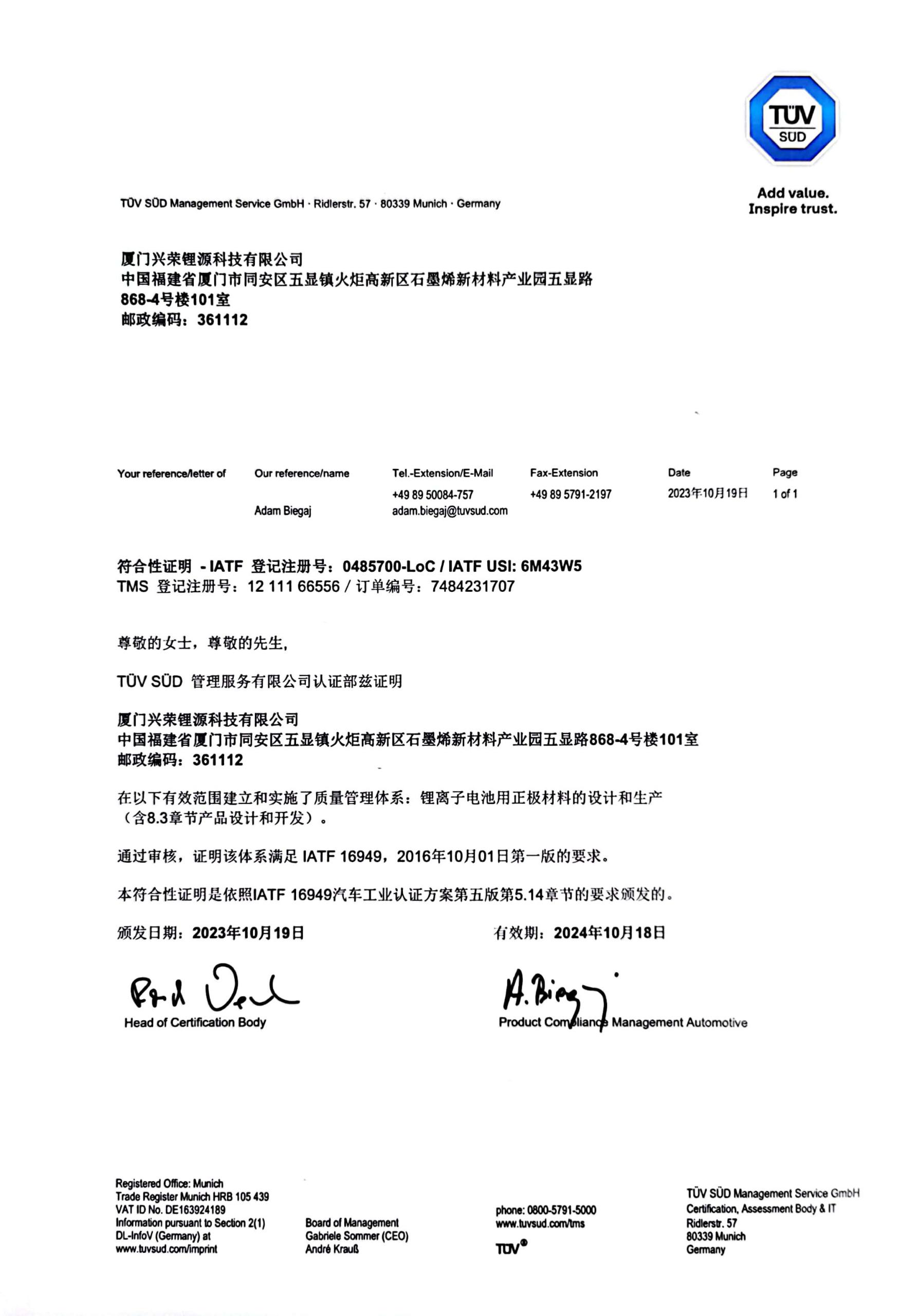 2023年10月19日興榮新源(廈門(mén))科技有限公司IATF16949汽車質(zhì)量管理體系獲得IATF官方認(rèn)可,頒發(fā)了符合性證明函,證明我司體系滿足IATF 16949,2016年10月01日第一版的要求。證書(shū)的獲得標(biāo)志著公司具有了進(jìn)入汽車領(lǐng)域的通行證,為公司開(kāi)拓市場(chǎng)奠定了基礎(chǔ),為公司參與市場(chǎng)競(jìng)爭(zhēng)做出了有力保障。